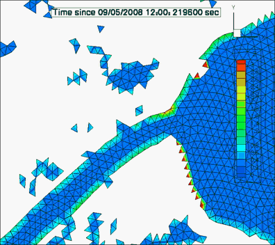 Wetting/drying simulation of a storm surge during hurricane Ike. Visible fractionally subdivided elements at the wet/dry interface.